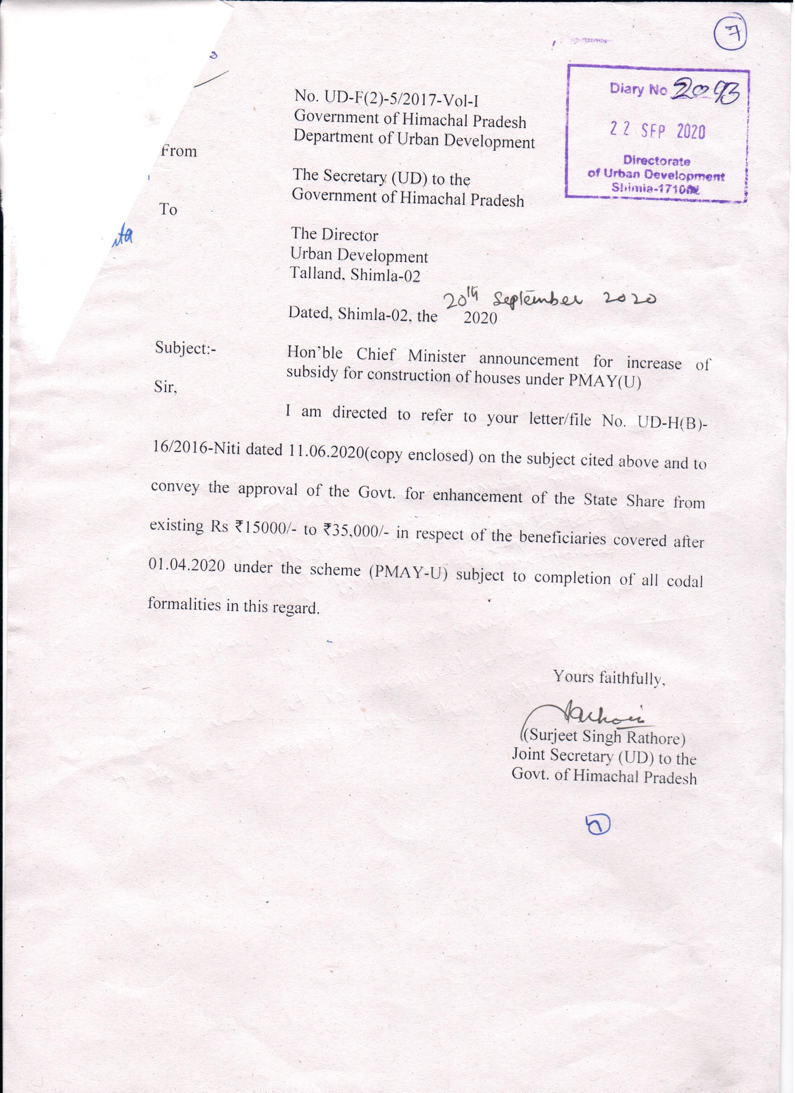 Announcement for increase of subsidy for construction of houses under PMAY(U)